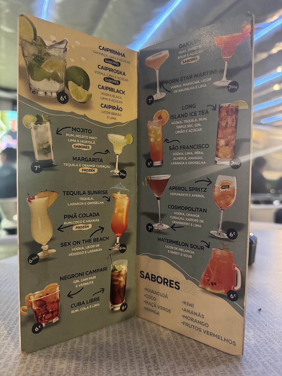 This menu offers a selection typical of a local café and bar, focusing on beverages and light food options. Visitors can expect a variety of alcoholic drinks, including cocktails such as mojitos, copa, cachorro, and caipirão, which are highlighted specialties. The drink options cater to casual consumption, suitable for social gatherings or light refreshment breaks.